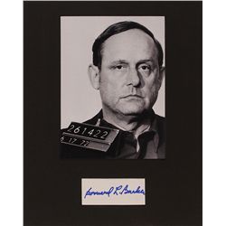One of the five Watergate burglars (1917–2009). Rare felt tip signature, “Bernard L. Barker,” on an off-white 2.75 x 1.25 card. Matted with a photo of