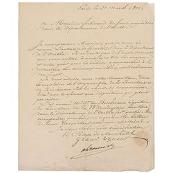 One of Napoleon’s favorite Marshals (1753–1815). LS in French, signed “Alexandre,” one page, 7.5 x 9.25, Paris, March 31, 1811. Letter to Ferdinand de