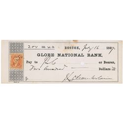 Bank check, 7.5 x 2.75, filled out and signed by Chamberlain, payable to” JLC” for $200.00, July 16, 1869. Check also bears a two-cent revenue stamp,