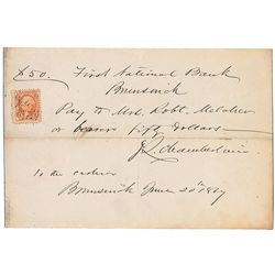 ADS, signed “J. L. Chamberlain,” one page, 8 x 5.5, June 20, 1867. Pay order reads, “Pay to Mrs. Robt. Melcher or bearer fifty dollars.” Order also be