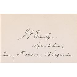 Crisp ink signature, “J. A. Early, Lynchburg, Virginia, January 5th, 1885,” on an off-white 4.25 x 2.75 card. In very fine condition.