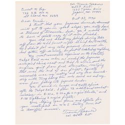 Pilot on plane 2 during the Doolittle Raid (1917–2004). ALS signed “Travis Hoover, Col. USAF Ret.,” one page, 8.5 x 11, October 20, 1994. Letter to an