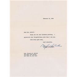 TLS, one page, 7.75 x 10.25, February 15, 1956. Brief letter of thanks for birthday wishes. In full: “Thank you for your birthday greeting. I apprecia