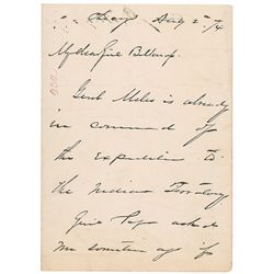 Union general (1831–1888) whose cavalry command blocked Lee’s escape at Appomattox. ALS signed “P. H. Sheridan,” one page both sides, 5 x 7, August 2,