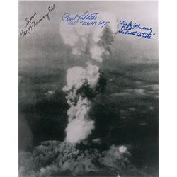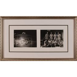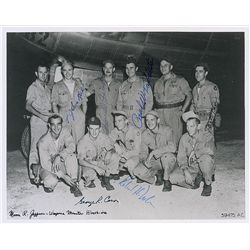 Glossy 10 x 8 photo of the crew posing in front of the Enola Gay, signed in felt tip and ink by Paul Tibbets, Tom Ferebee, Dutch Van Kirk, Jacob Beser