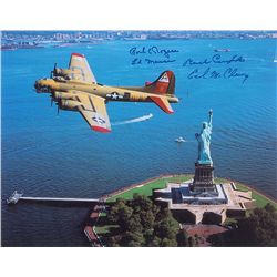 Color glossy 14 x 11 photo of a plane soaring over the Statue of Liberty, signed in blue felt tip by Buck Compton, Ed Mauser, Earl McClung, and Paul R