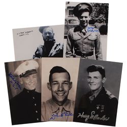 Five glossy photos, 4 x 6 and 6 x 4, each signed in ink or felt tip by the Battle of Okinawa participant pictured. Signers are: Charles ‘Red’ Womack,