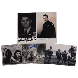 Eight glossy photos, one color, 4 x 6 and 6 x 4, each signed in ink by an Iwo Jima participant. Signers are: Dave Severance, Richard Rothwell, Gerald