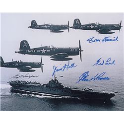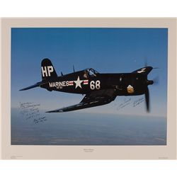 Color 20 x 15.75 poster of a Black Sheep Corsair F4U, signed in black ink and felt tip by five Marine Corps Medal of Honor recipients: Jeff DeBlanc, J