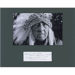 Ballpoint signature, “From Dr. Joe Medicine Crow, Lodge Grass, MT, July 23, 2011,” on a white 3.75 x 1.25 slip. Matted with a photo of Crow to an over