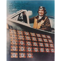 Two items: satin-finish 8 x 10 photo of Gabreski in the cockpit of his plane, signed in black felt tip; and a hardcover edition of Gabby: A Fighter Pi