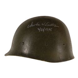 Green US military combat helmet, no liner or straps, signed on the outside in silver ink, “Charles W. Lindberg, 2/23/1945.” In fine condition.