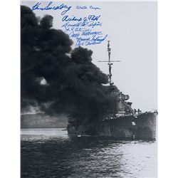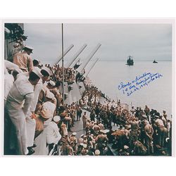 Two photos: glossy 14 x 11 photo of the Japanese surrender on the Missouri, signed in blue felt tip by Bruce Matheson, Henry Bourgeois, R. W. McClurg,