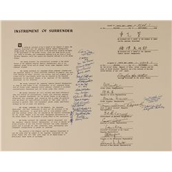 Souvenir print of the Japanese Surrender, 22 x 17, signed in blue felt tip by 17 Doolittle Raiders, two crew members of the Enola Gay and three others