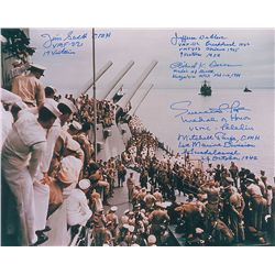 Color satin-finish 10 x 8 photo of the Japanese surrender on board the Missouri, signed in blue felt tip by five Pacific Medal of Honor recipients: Ji
