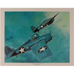 Color 22.75 x 18 print entitled ‘The Fighters’, signed in blue and black ink by Bob Maxwell, Frederick Payne, Swede Vejtasa, Alex Vraciu, Marion Carl,
