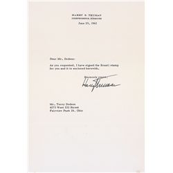 TLS, one page, 7.25 x 10.25, personal letterhead, June 29, 1962. Letter to a collector, in full: “As you requested, I have signed the Brazil stamp for