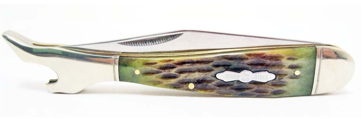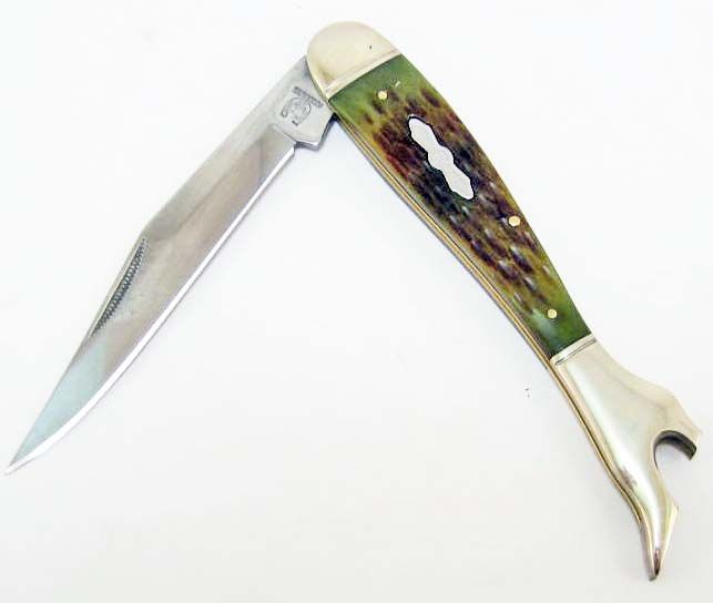 5" closed. Stainless clip blade. Amber jigged bone handles. Nickel silver bolsters and inlay shield.