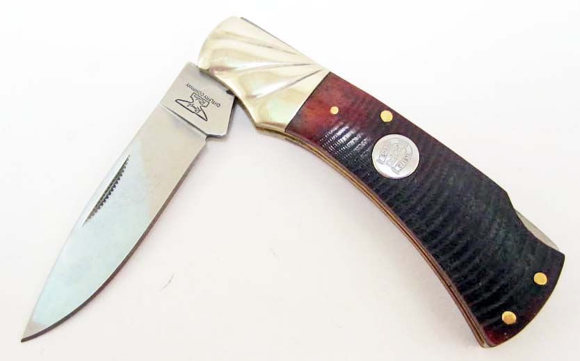3 5/8" closed. Stainless drop point blade. Brown sawcut bone handles with fluted nickel silver bolster. Inlay shield.