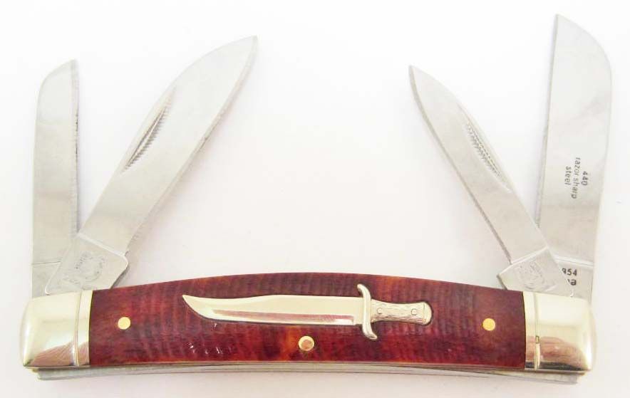 Bowie Series Congress. 4 1/8" closed Four (4) blade. 440 stainless blades. Brown sawcut bone handles with nickel silver bolsters and bowie inlay shield. Master blade is etched Bowie Series - An American Tradition with star and American flag