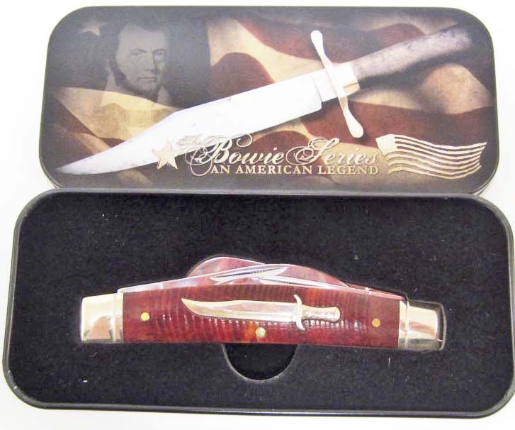 Bowie Series Congress. 4 1/8" closed Four (4) blade. 440 stainless blades. Brown sawcut bone handles with nickel silver bolsters and bowie inlay shield. Master blade is etched Bowie Series - An American Tradition with star and American flag