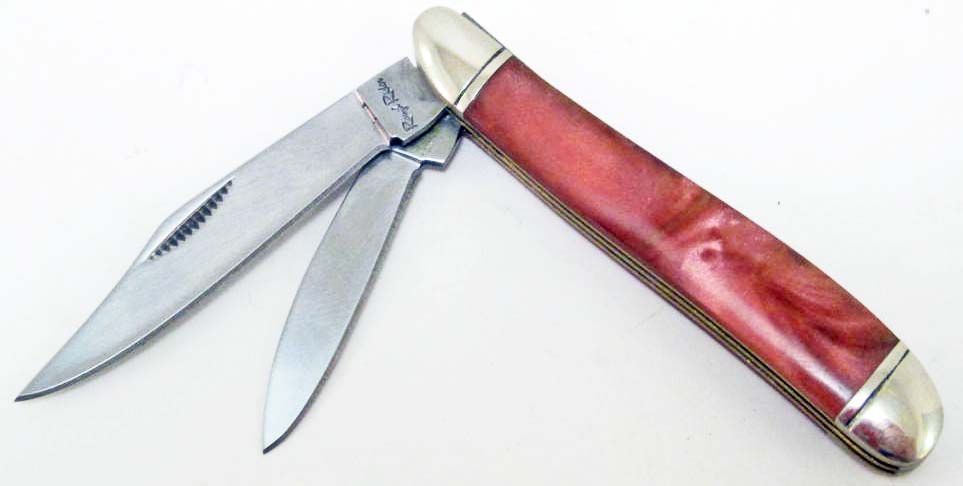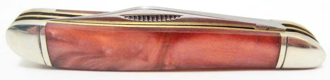 2 3/4" closed. Stainless clip and pen blades. Rough Rider tang stamp. Sunset cracked ice celluloid handles with grooved nickel silver bolsters