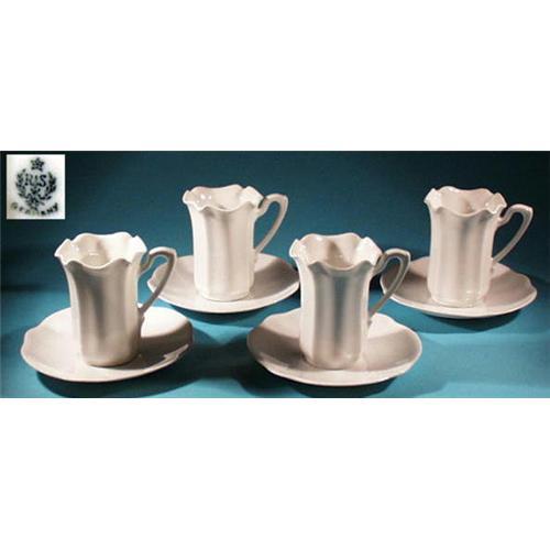 Very delicate set of four Art Nouveau chocolate cups and saucers. The porcelain body is very thin, almost see through. 2 cups have one small chip on the outside rim, other 2 pieces are perfect. Each cup and saucer is "signed" with blue mark RS GERMANY. Dimensions : cup is 3.25"H, saucer is 4.75" in diameter. Germany circa 1900, mold #549.