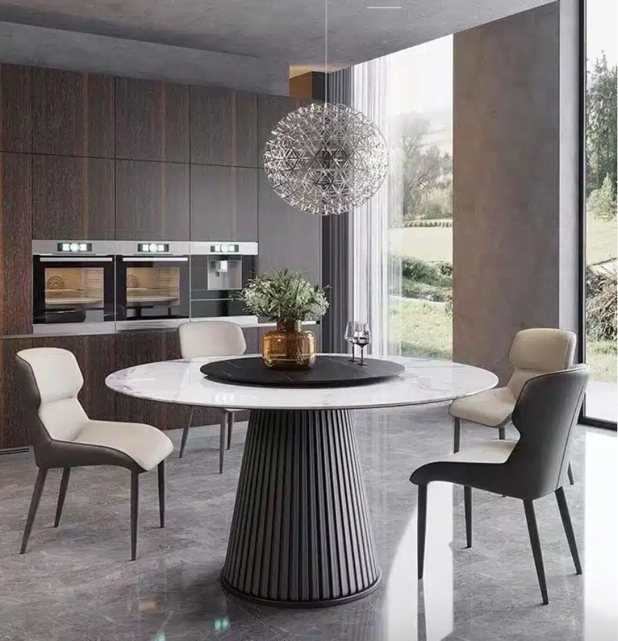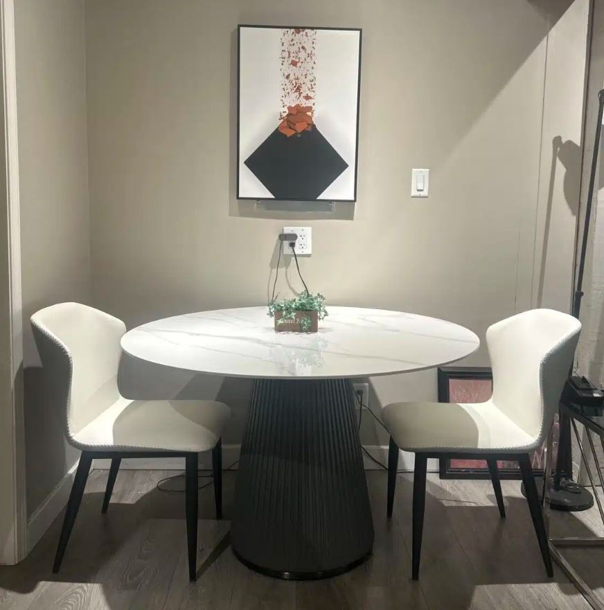 RS NEW Douglas 47" Pandora Sintered Stone Dining Table - Retails: $1899 - sintered stone round dining table with modern simple base. Colour options cloud or pandora; sizes 47or 53diameter. Selected variant: 47" Pandora.