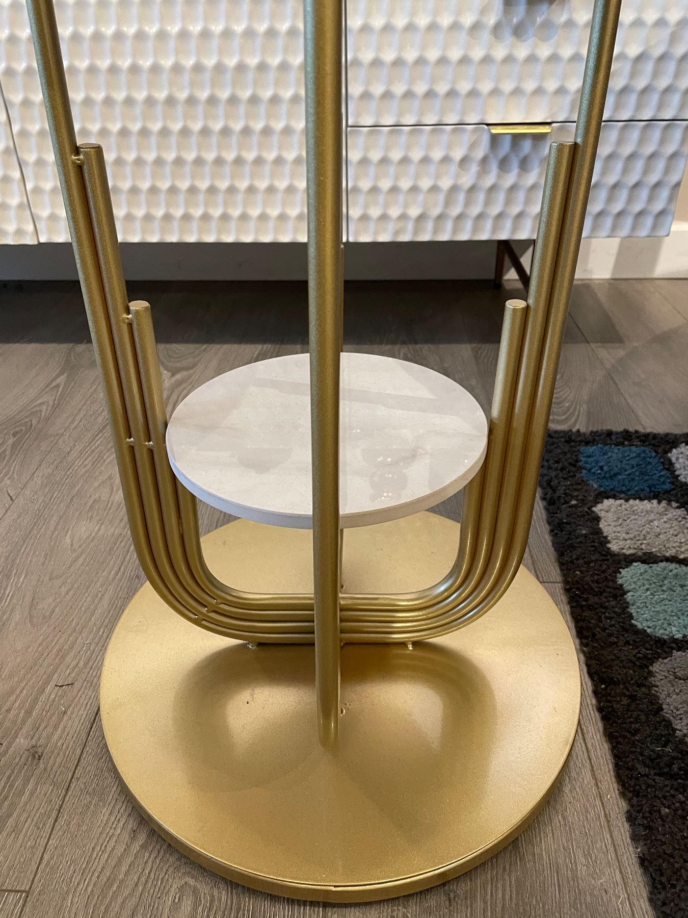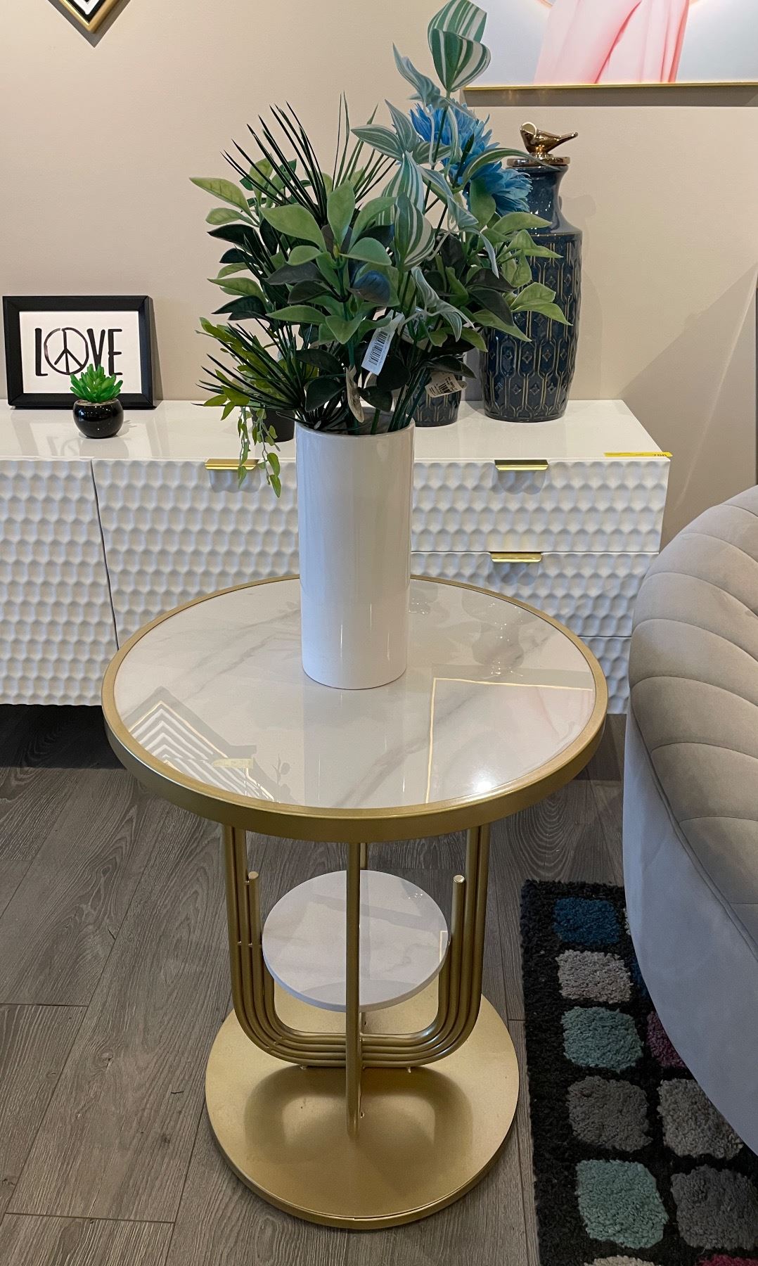 Stylish modern side Olivia side table with marble top and golden base; approximate size 20" diameter, 26" height. - located in Store