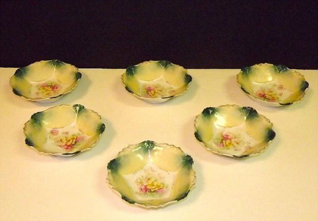 For your consideration is this beautiful antique RS PRUSSIA berry bowl set. The set includes 6 bowls in good vintage condition, one bowl has a manufacturing flaw. The berry bowls offer a gorgeous floral design on the beige and emerald green background. These beauties measure about 5 1/2" wide. All pieces have "RS PRUSSIA" stamp on the bottom.