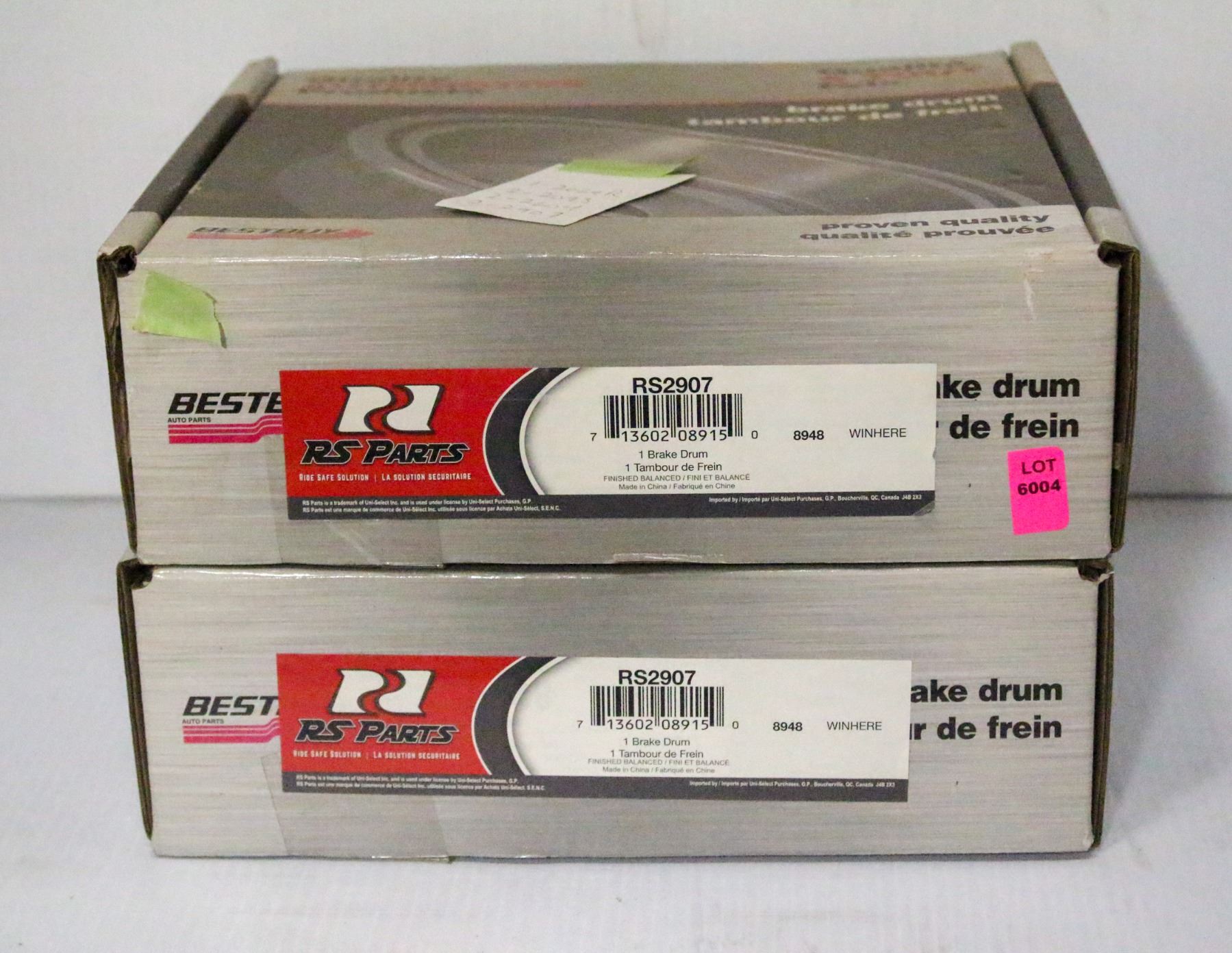 SET OF TWO RS PARTS REAR BRAKE DRUMS, PART NUMBER RS2907. SOLD TOGETHER AS A COMPLETE AXLE SET. DIRECT OEM-SPEC REPLACEMENTS FOR SELECT CHRYSLER, DODGE AND PLYMOUTH MODELS (1985–2004).