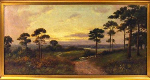 RSG Johnson - Declining Day View towards Basingstoke and Reading, oil onto canvas of a farmer leading cattle along a path in a gilt frame, 29cm x 58cm