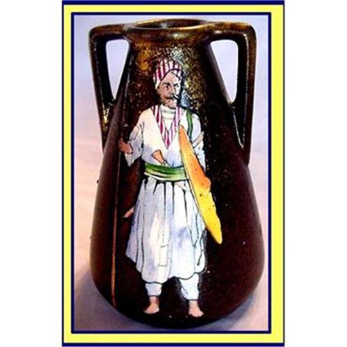 Amphora vase made in Teplitz by Stellmacher ( RStK ) 1905-6 with enamelled Arab warrior.<BR>4 3/4inches high.<BR>Beatifully shaped tapering vase with handles at right angles to the body like tubes joining into the neck. Mottled bronze and gold finish.<BR>The front is hand enamelled with a standing Arab warrior, shield in one hand, a long spear in the other. Tucked into his belt is a dagger and he wears a wonderful turban of red and white stripes. Standing barefoot, he is the epitomy of the Victorians fascination with Arabia.<BR>Underneath is the Stellmacher Teplitz, Austria mark, used 1905-6 (Scott, page 329).<BR>Mint condition - absolutely no damage of any sort.