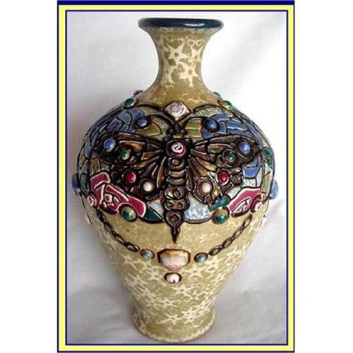 Classic enameled and jeweled vase by Amphora Work Reissner Stellmacher and Kessel, Turn Teplitz, Bohemia, early 1900's.<BR>9 inches high.<BR>Very unusual carved Amphora vase has a butterfly carved and enameled and surrounded by a band of stylized carved roses and raised jewels of varying sizes, in a rich variety of colours. Neck and lower body have a most unusual pattern of cream stars and mosaics on a green ground. Lip is finished in a rich cobalt blue.<BR>Marked underneath with an oval green mark, impessed 15316 and a brown mark that could be an F.<BR>Excellent condition with no chips/cracks/damage of any sort.<BR>Please enquire about a 2nd, itentical vase.