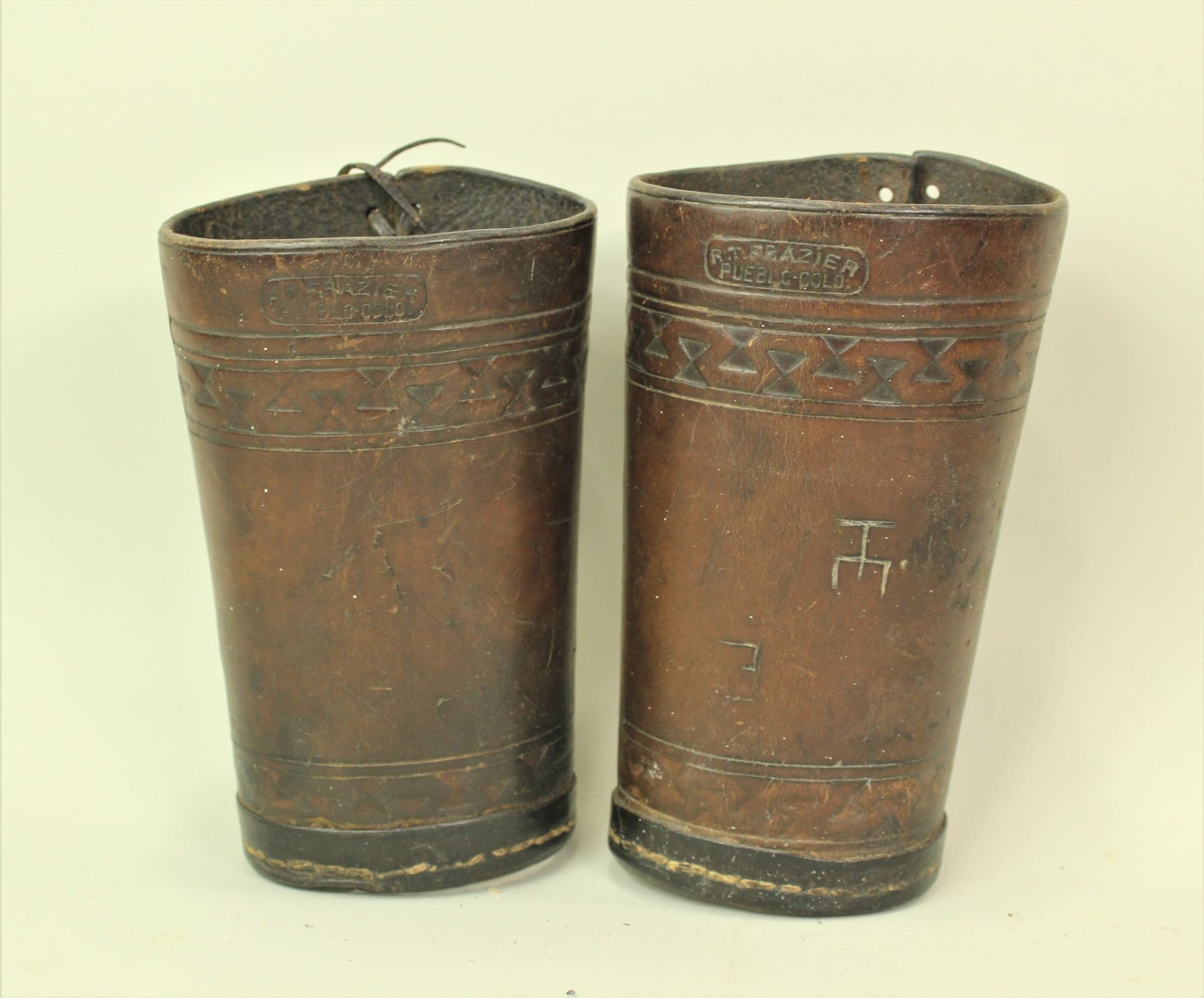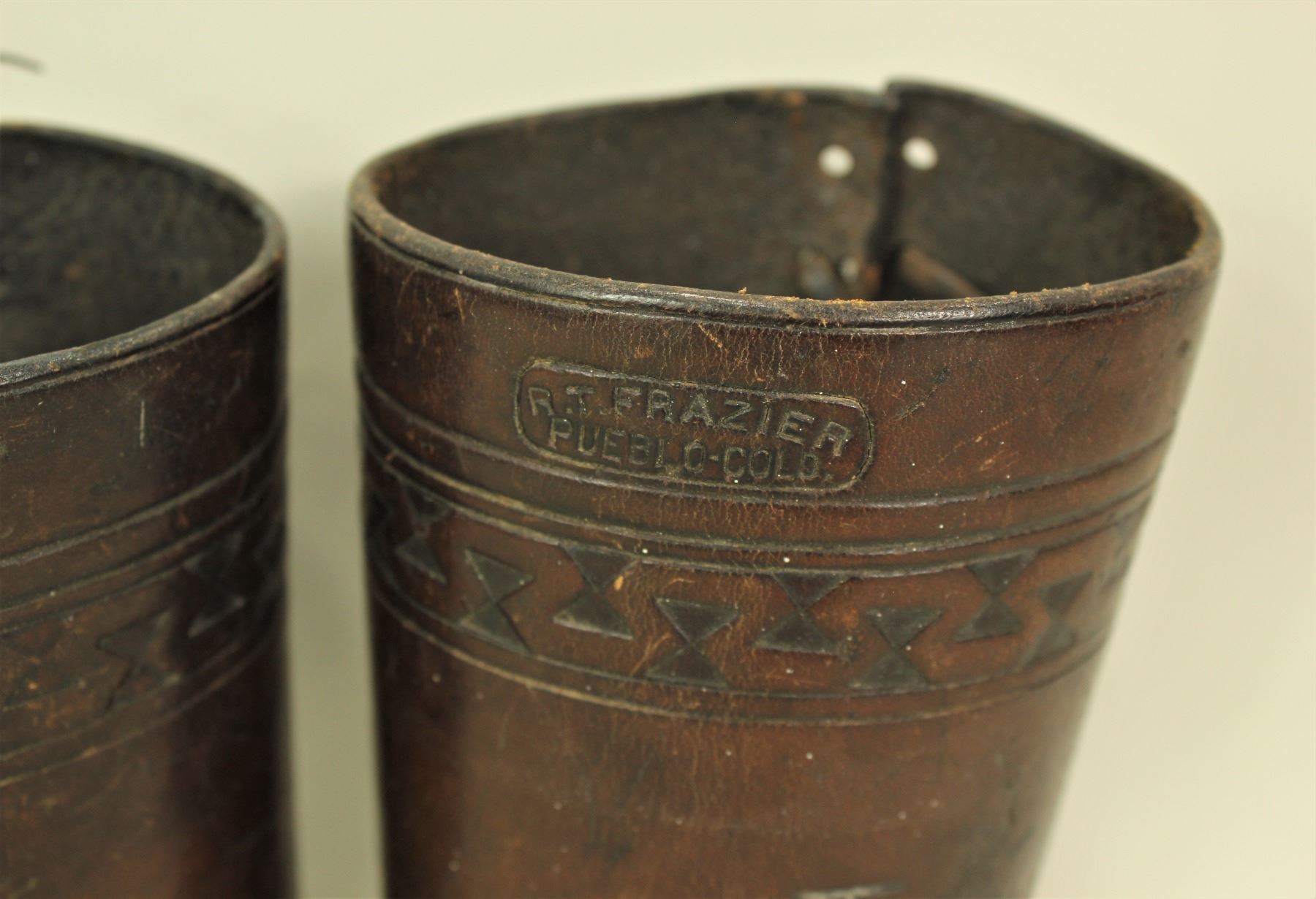 A pair of used cowboy cuffs with intriguing border stamp pattern, nice maker's mark and dark patinaed color.