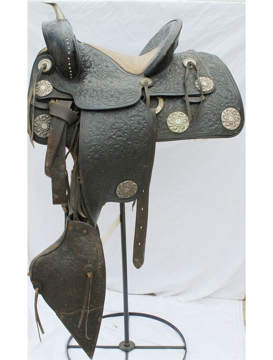 Great RT Frazier Saddle; a large saddle with a 16" quilted seat, square skirts, full flower tooled with massive molded medallions and string conchos, exceptionally tall cantle, nickel horn, and 21" tapaderos. In nice condition with original sheepskin, having had slight trimming to the tops of the fenders.