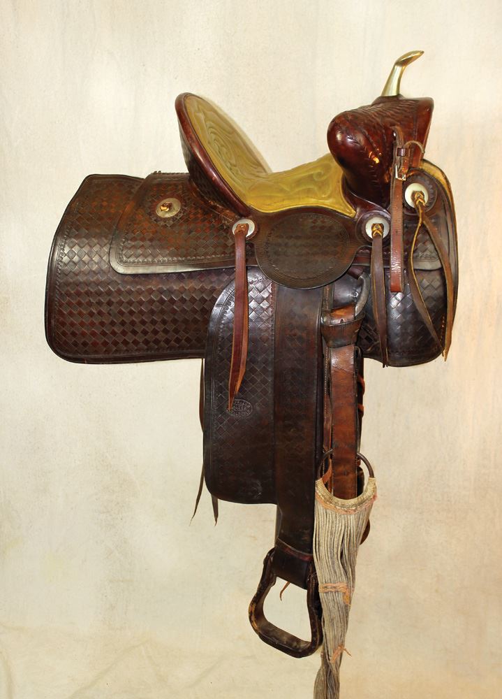An amazing and very scarce saddle made by RT Frazier. With fantastic rare features like huge 29" flared skirts, unusual quilted seat, super tall nearly 6" high cantle, tall nickel horn, 18" wide bowed bear trap swells, basketstamped from top to bottom and finished off with Frazier marked stirrups, great original cinch and very lightly used condition.