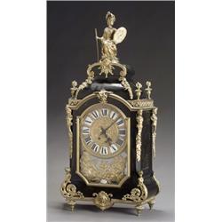 Having a two train movement with outside countwheel, striking on a bell. The face with enamel signature plaque painted Martinot/Paris. The backplate stamped H&F/Paris. Sides of case with brass marquetry painted black; mounts with some overpainting to gilding; some mounts and one foot detached; lacking pendulum.