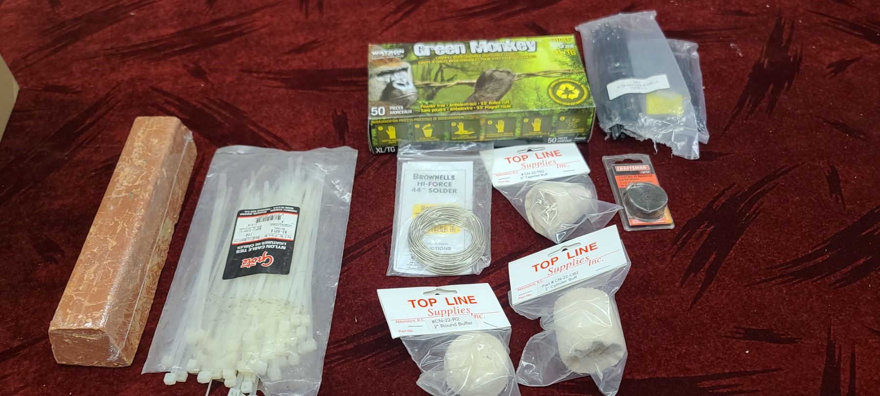 RUBBER GLOVES, BUFFERING WHEEL AND SOLDERING WIRE
