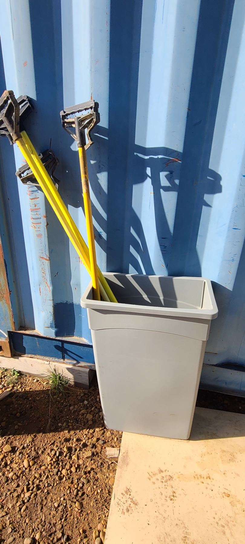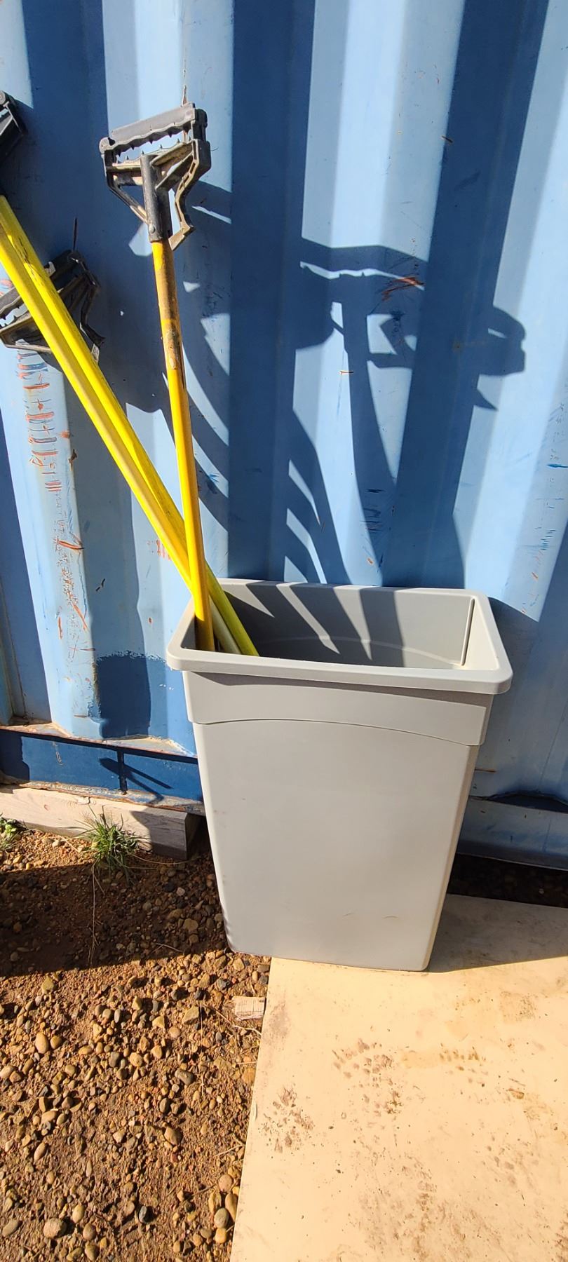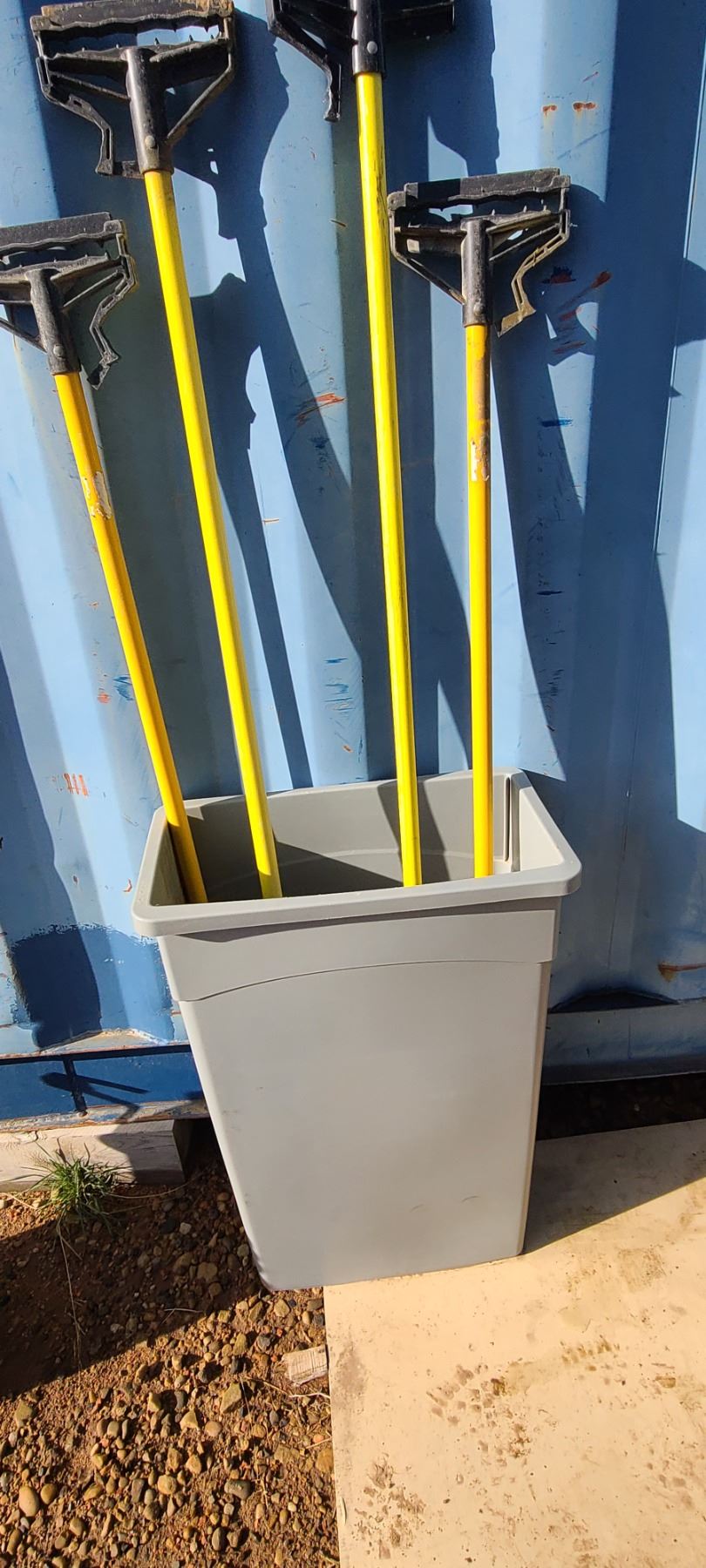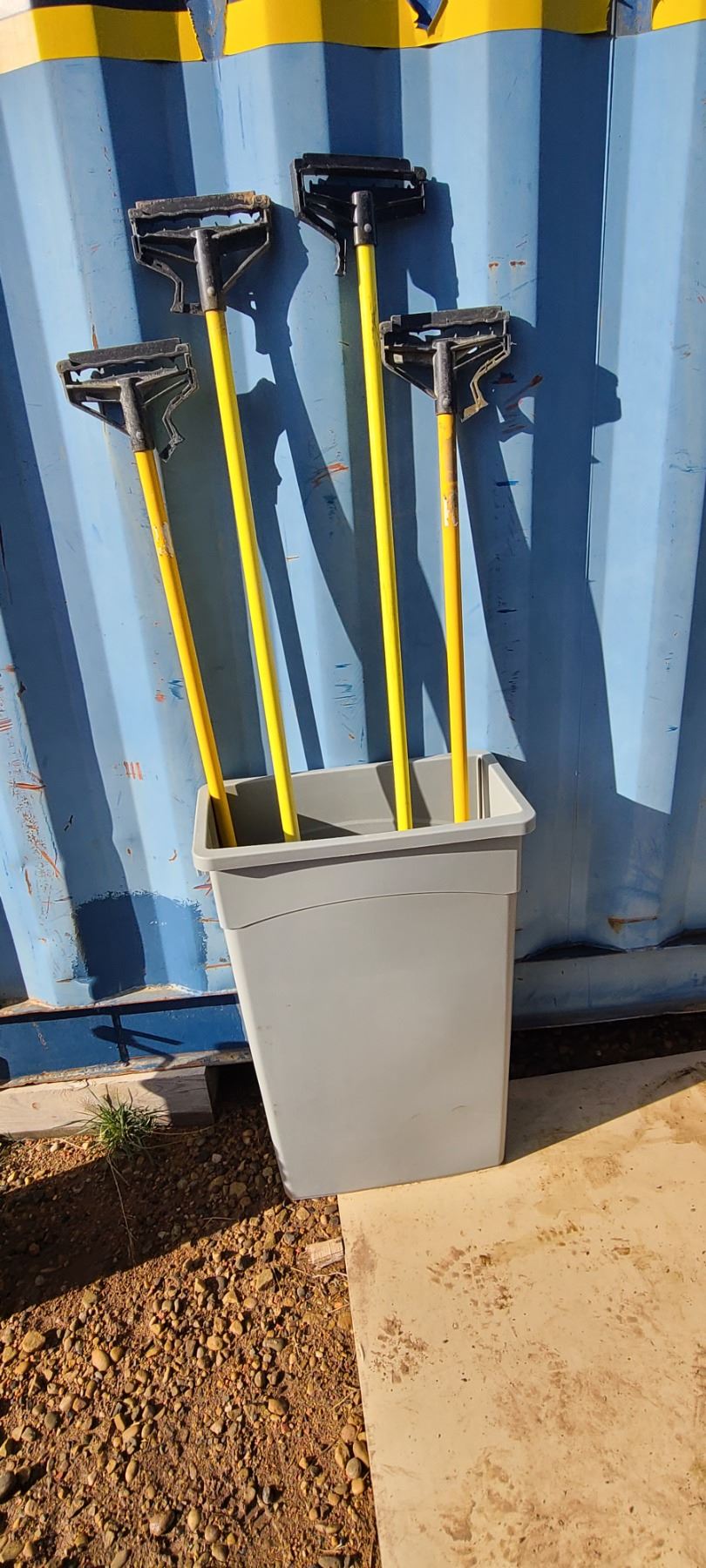 RUBBER MAID TRASH CAN PLUS FOUR COMMERCIAL GRADE MOP HANDLES