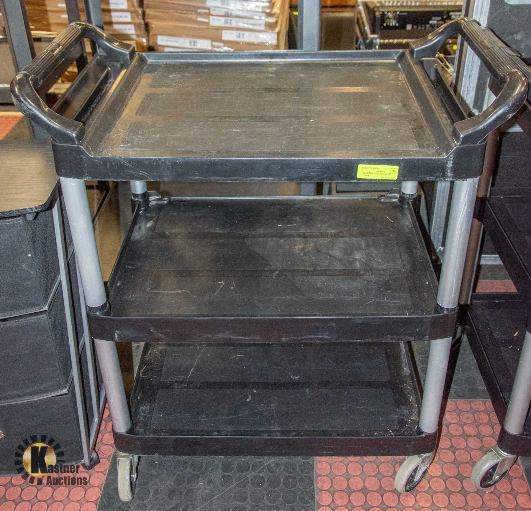 ROLLING CART, 200 LBS. CAPACITY, BLACK, WITH BRUSHED ALUMINUM UPRIGHTS, FOR FOOD SERVICE/RESTAURANT/CLEANING SERVICE/UTILITY/PUSH **ALL ITEMS MUST BE REMOVED BY 5PM SATURDAY, OCTOBER 19TH 2024. ALL REMAINING ITEMS WILL BE SUBJECT TO A $6.00 PER DAY STORAGE CHARGE. ANY ITEMS REMAINING AFTER MONDAY, NOVEMBER 4TH 2024 WILL BE CONSIDERED FORFEITED. NO REFUNDS WILL BE ISSUED FOR FORFEITED ITEMS. TO SCHEDULE A PICK UP APPOINTMENT CLICK HERE