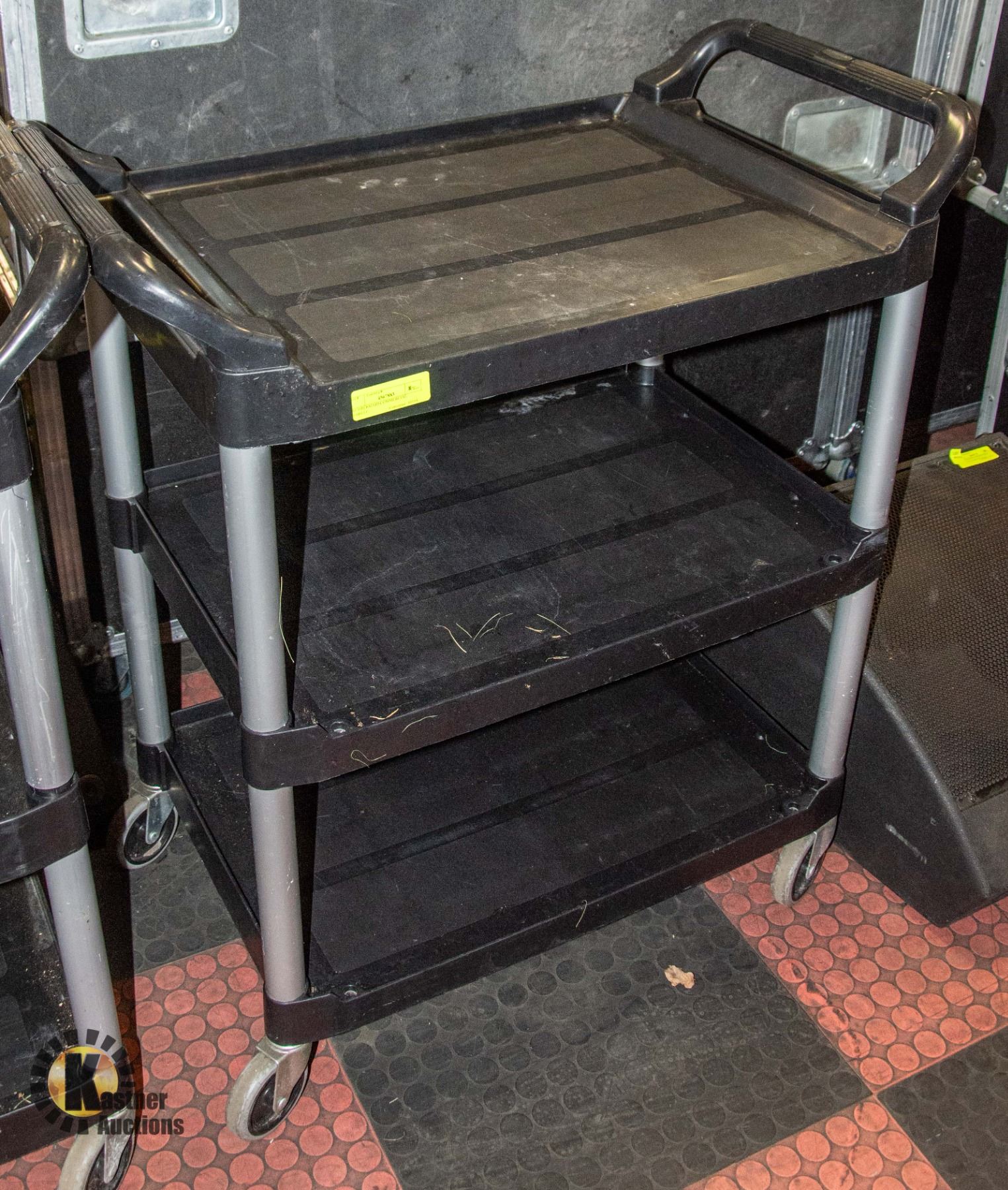 ROLLING CART, 200 LBS. CAPACITY, BLACK, WITH BRUSHED ALUMINUM UPRIGHTS, FOR FOOD SERVICE/RESTAURANT/CLEANING SERVICE/UTILITY/PUSH **ALL ITEMS MUST BE REMOVED BY 5PM SATURDAY, OCTOBER 19TH 2024. ALL REMAINING ITEMS WILL BE SUBJECT TO A $6.00 PER DAY STORAGE CHARGE. ANY ITEMS REMAINING AFTER MONDAY, NOVEMBER 4TH 2024 WILL BE CONSIDERED FORFEITED. NO REFUNDS WILL BE ISSUED FOR FORFEITED ITEMS. TO SCHEDULE A PICK UP APPOINTMENT CLICK HERE