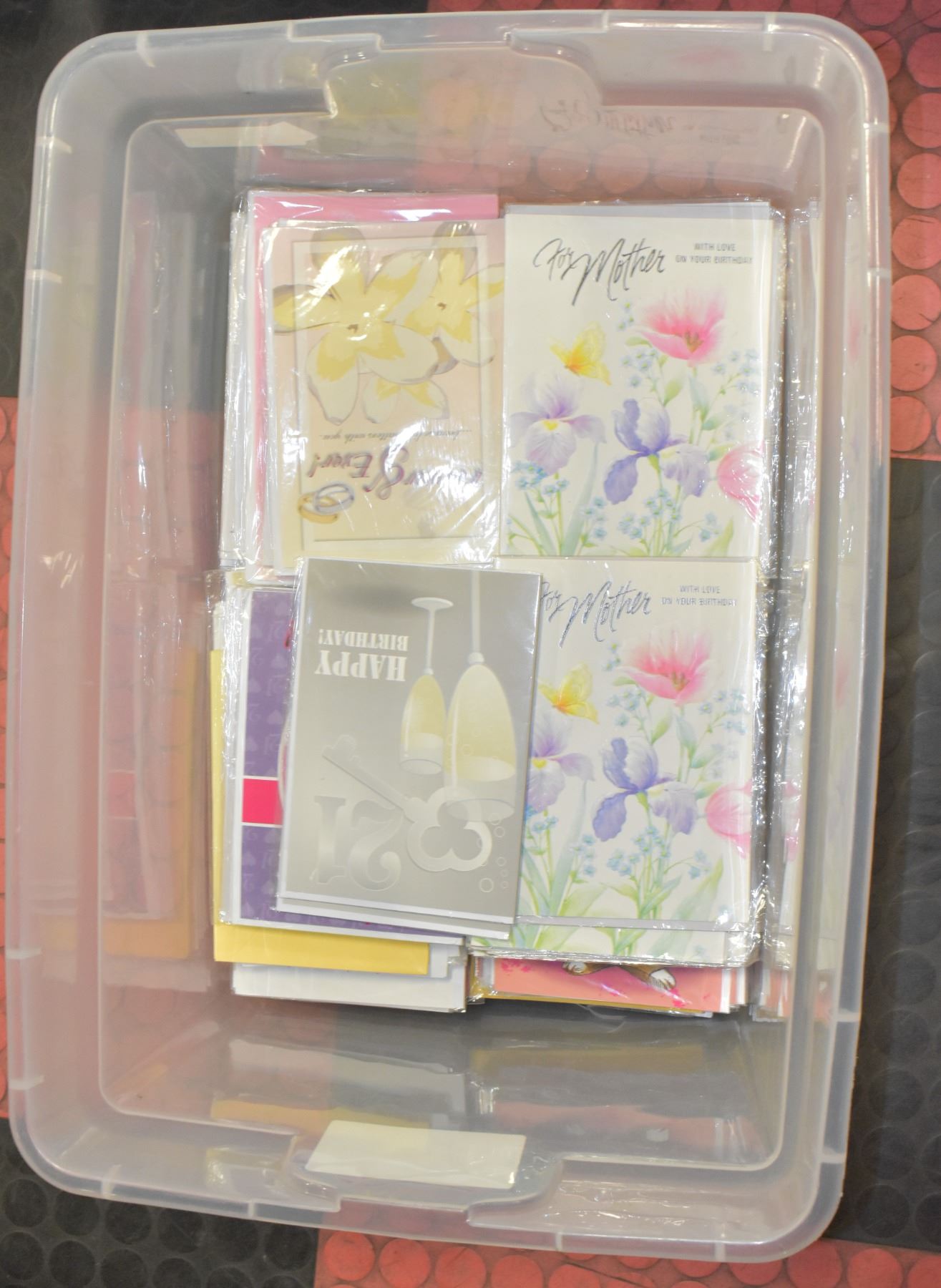 RUBBERMAID CONTAINER FULL OF NEW GREETING CARDS