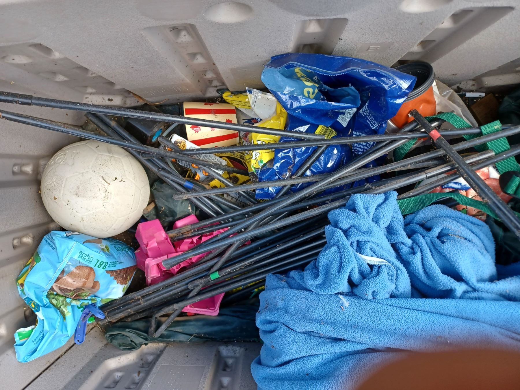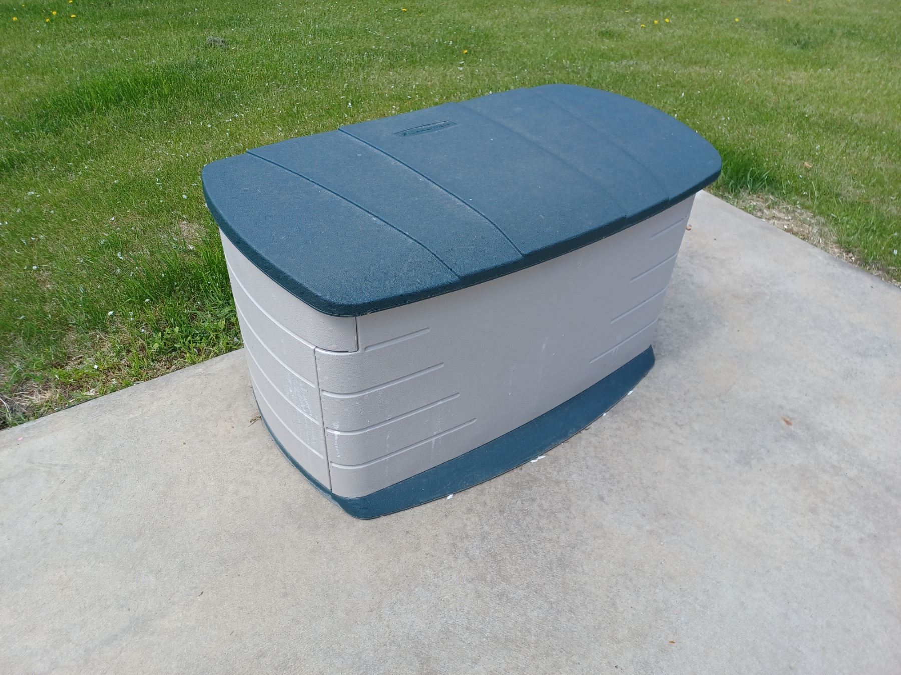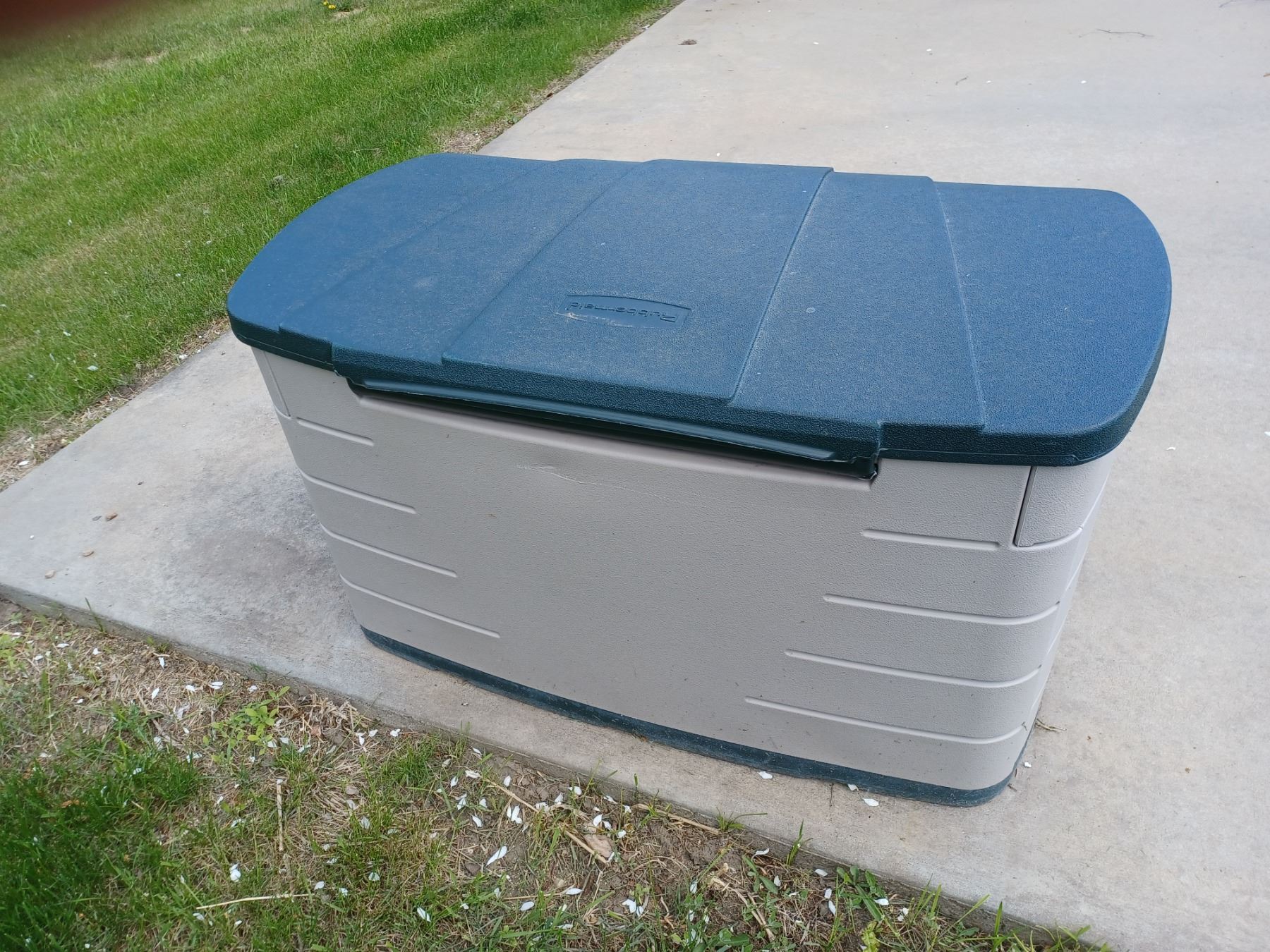 RUBBERMAID PATIO STORAGE BOX WITH CONTENTS