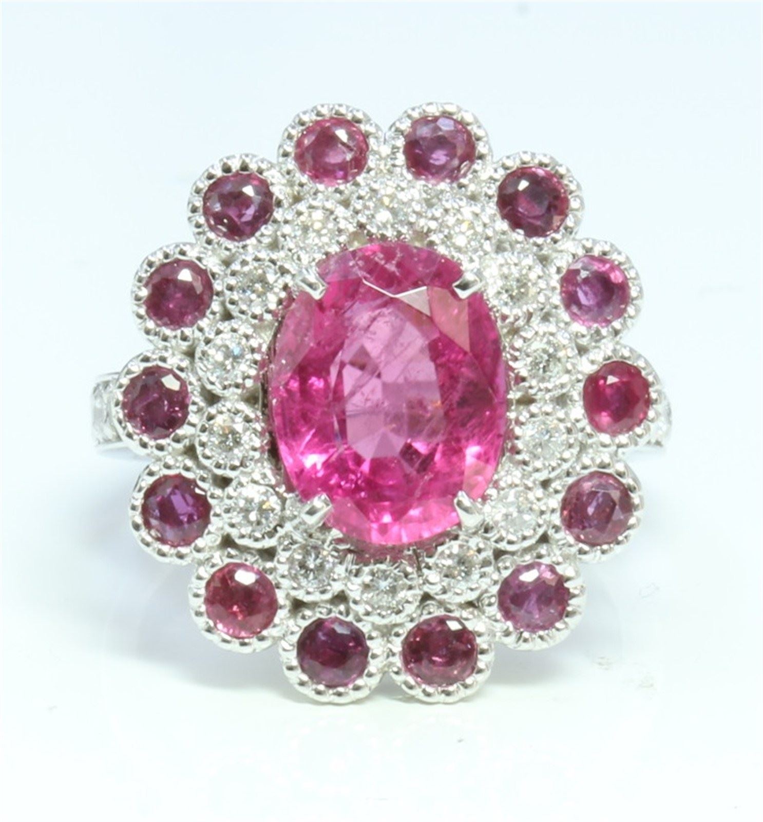 14K WHITE GOLD RING 8.1GRAM DIAMOND 0.59CT RUBY 1.14CT ROUND PINK TOURMALINE 3.10CT