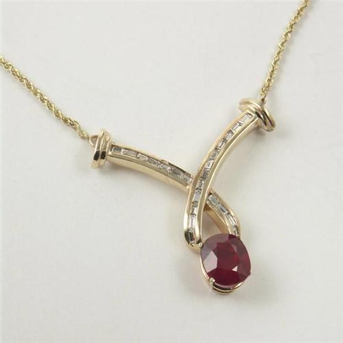 NECKLACE: Elegant 14k yellow gold necklace set with an oval cut ruby accented with baguette cut diamonds. The ruby measures approximately 6.03 cts and the diamonds measure approximately 0.75 ctw. No appraisal is included with this lot.