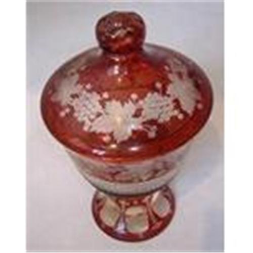 FINEST RUBY CUT TO CLEAR BOHEMIAN COVERED DISH IN INTRICATE DESIGNS; QUITE MODERN FOR IT'S ERA. NOTICE THE DIAMOND PATTERNED CRYSTAL. APPROX 11" TALL. ONLY MINOR SCRATCH TO FOOT OF DISH