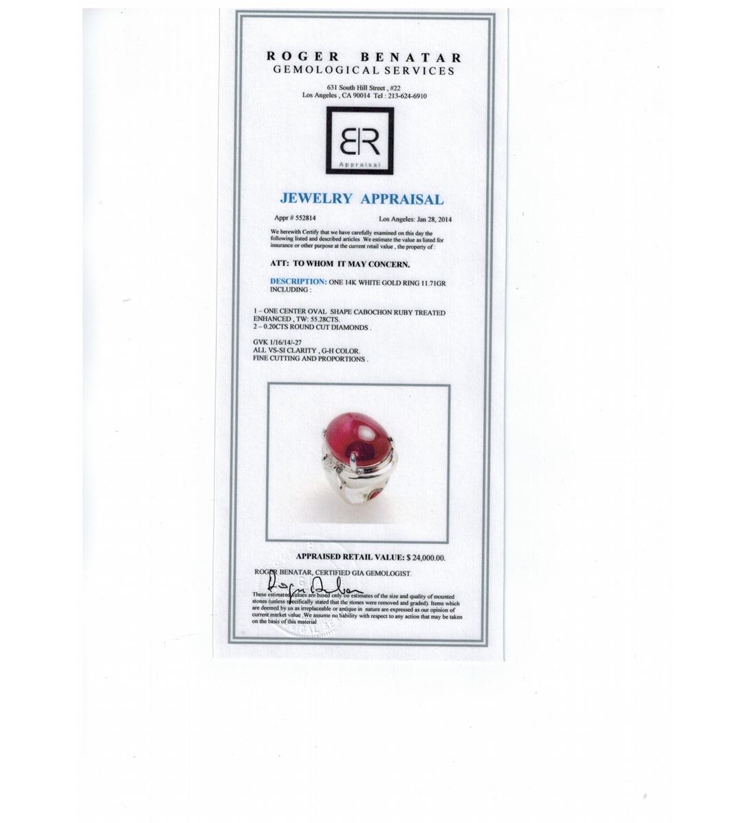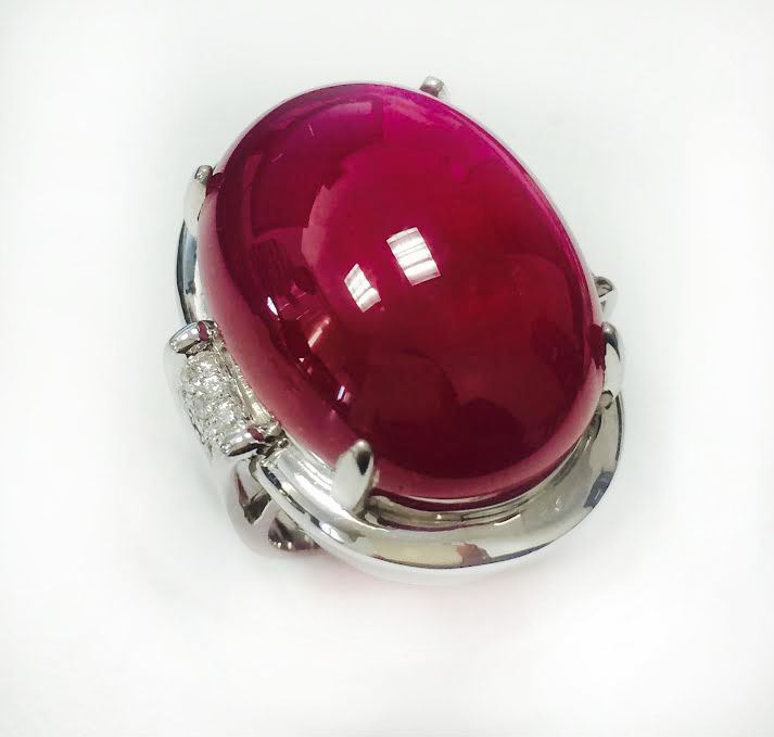 RUBY CAB 55.28CT, 14K W/G RING 11.79GRAM / DIAMOND 0.20CT