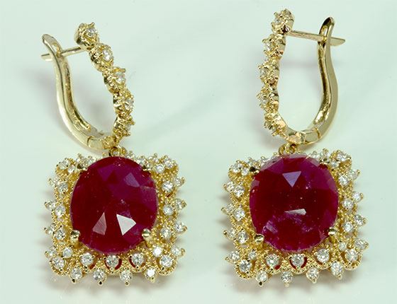 RUBY CABOCHION 11.21CT / DIAMOND 1.27CT / 14K YELLOW GOLD EARRING 8.91GRAM / GVK 2/3/14(5)