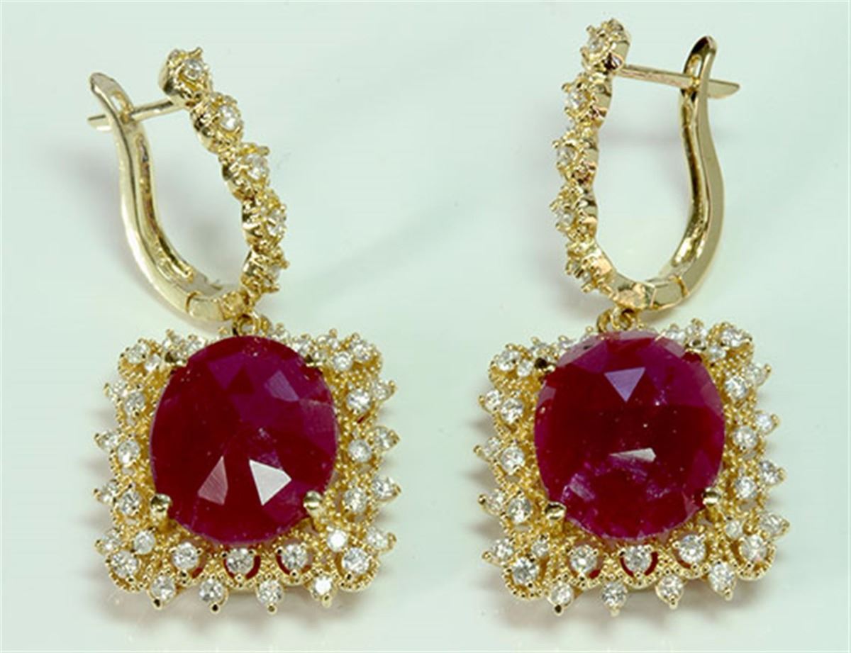 RUBY CABOCHION 11.21CT / DIAMOND 1.27CT / 14K YELLOW GOLD EARRING 8.91GRAM
